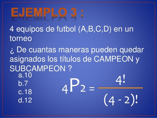 3;La Combinatoria es la parte de las Matemáticas que estudia las diversas formas de realizar agrupaciones con los elementos de un conjunto, formándolas y calculando su número.